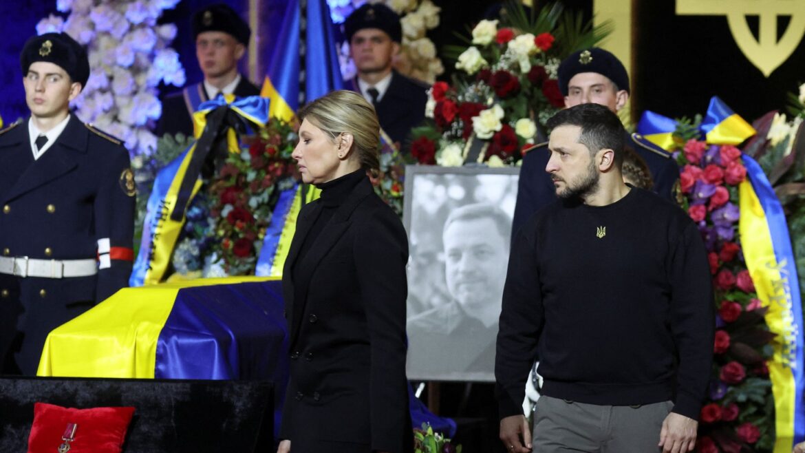 At the sombre service in Kyiv, Mr Zelenskyy and his wife, first lady Olena Zelenska, laid flowers on seven coffins draped in the blue and yellow flag of Ukraine and spoke with family members.